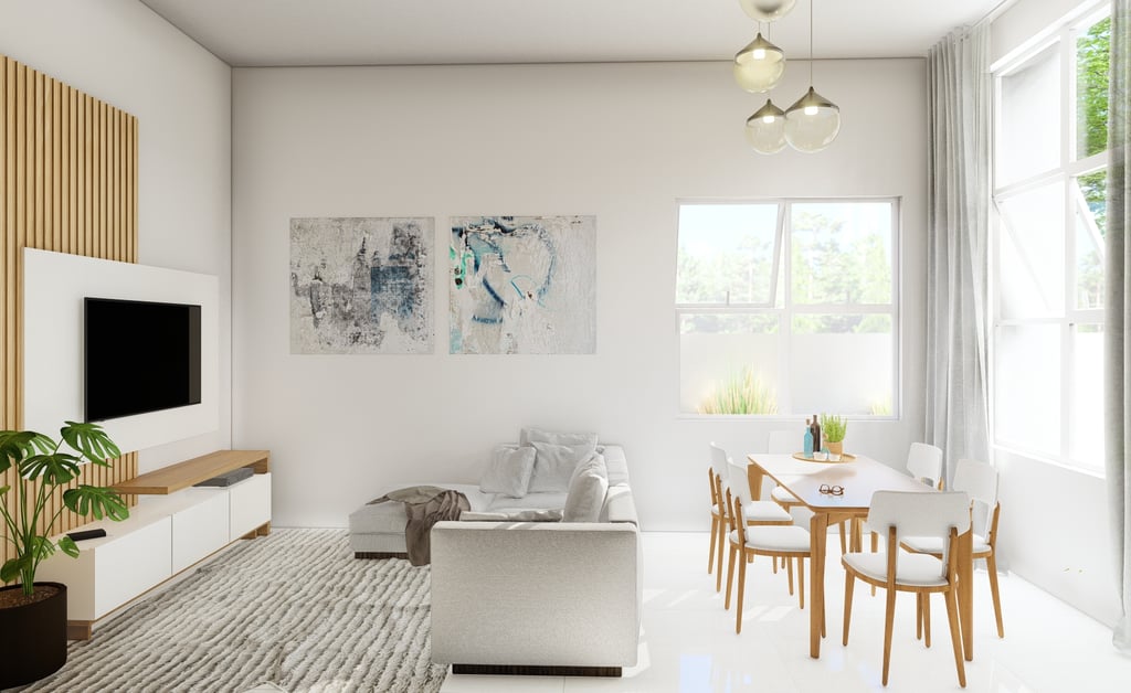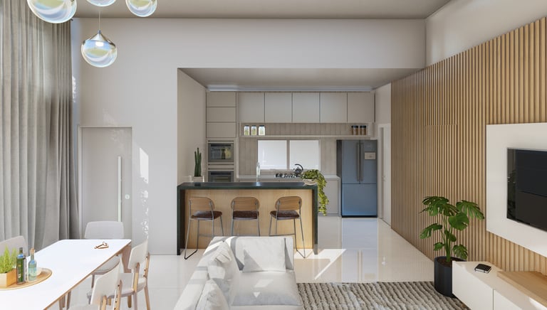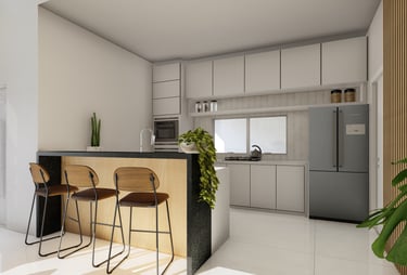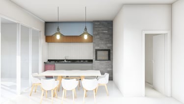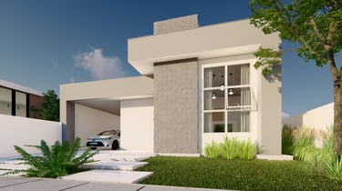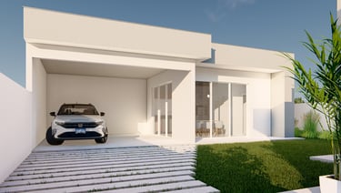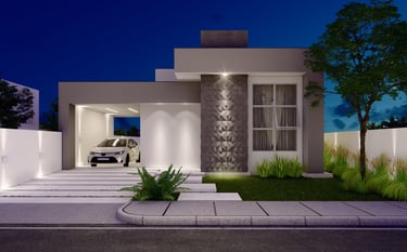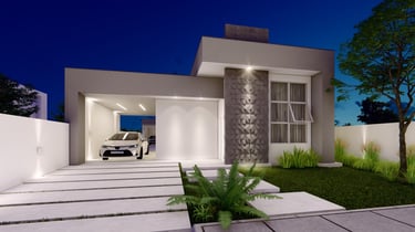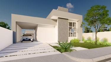 A casa foi projetada para atender as necessidades e desejos específicos de seus moradores, com um espaço amplo de Sala de Estar/ Jantar e Cozinha no mesmo ambiente, separando a área privativa da área comum, possui uma vaga de garagem coberta na lateral, e uma garagem nos fundos ao lado da edícula.