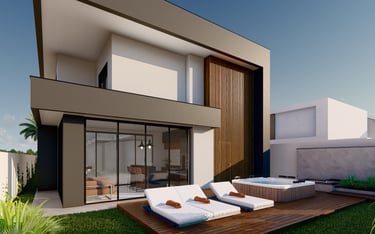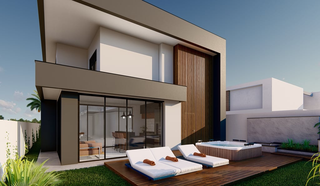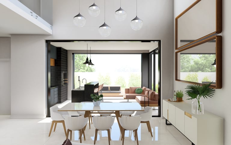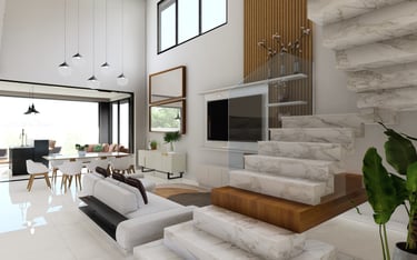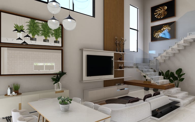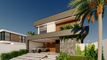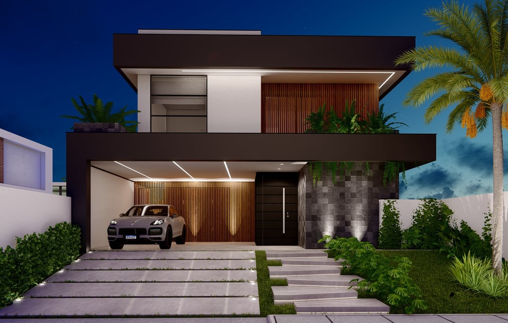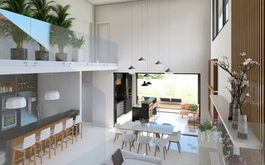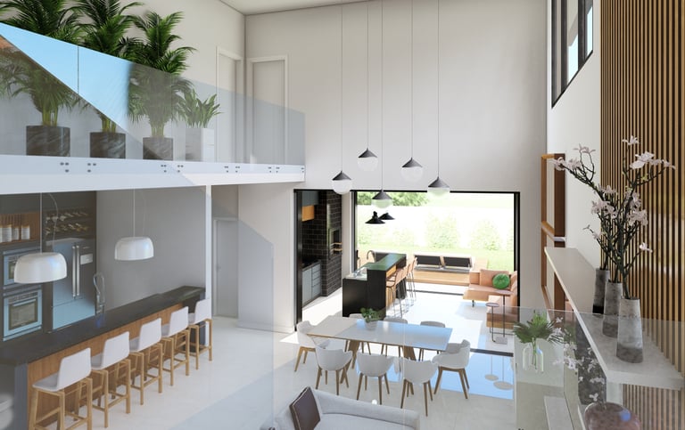 Foi priorizado o conforto térmico e privacidade, as aberturas são amplas e estrategicamente posicionadas para permitir a entrada generosa de luz natural, criando uma atmosfera arejada e iluminada no interior da casa. As salas com pé direito duplo é um caso à parte, que deixam o ambiente ainda mais amplo.